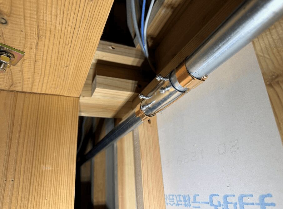 金属管で施工することで、誘導やノイズを完全に遮断できます。金属管には必ず接地アースを取り、ノイズや雑味を大地へ逃がします。