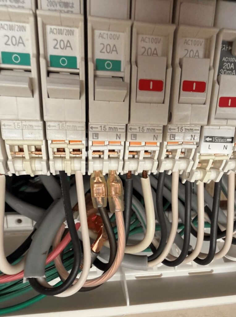 分電盤には3本の線で電気が供給されています。真ん中がN(ニュートラル)で、R相-N-T相という構成です。R相とNで100V、T相とNで100V、R相とT相で200Vを取り出せます。