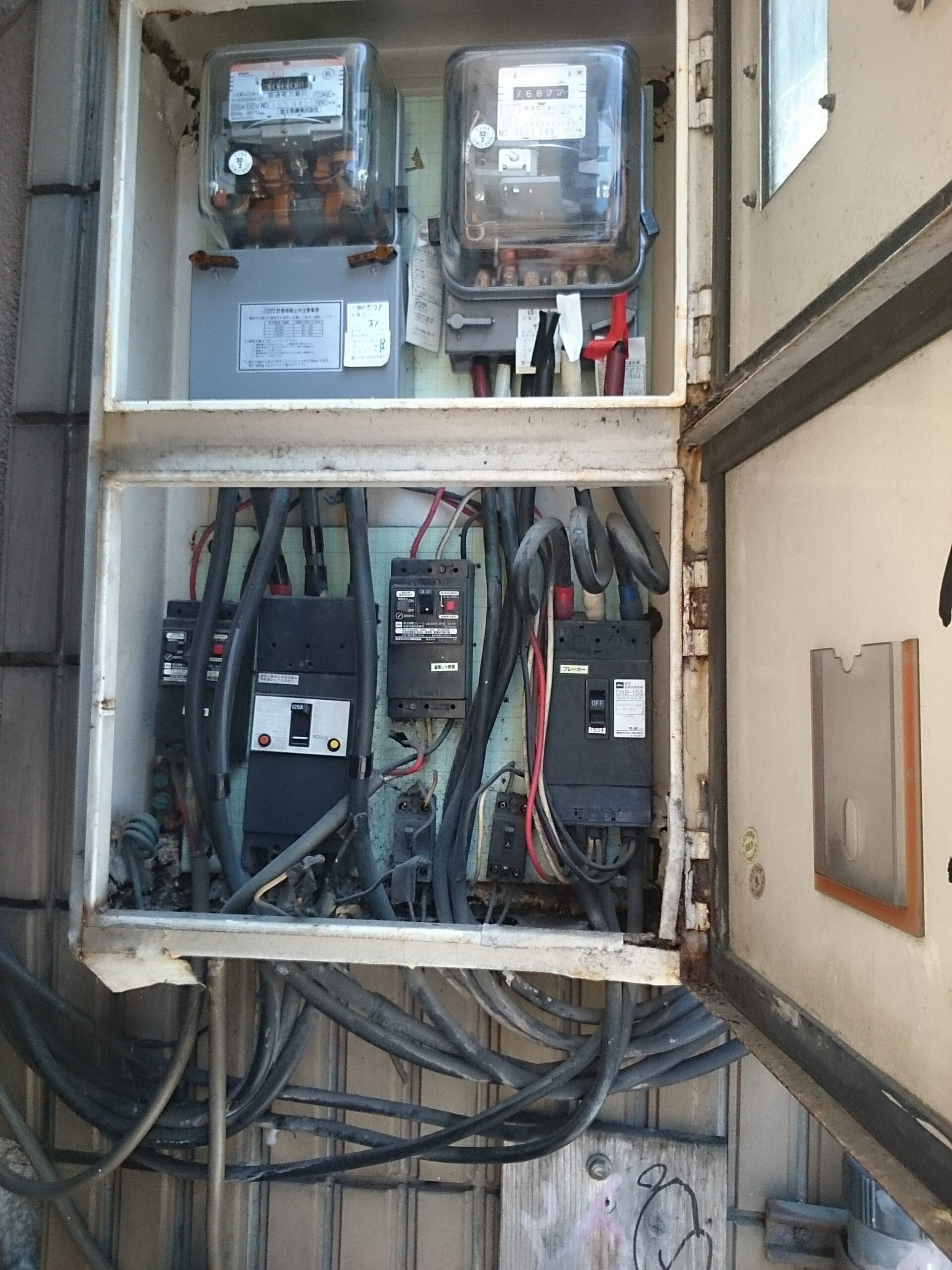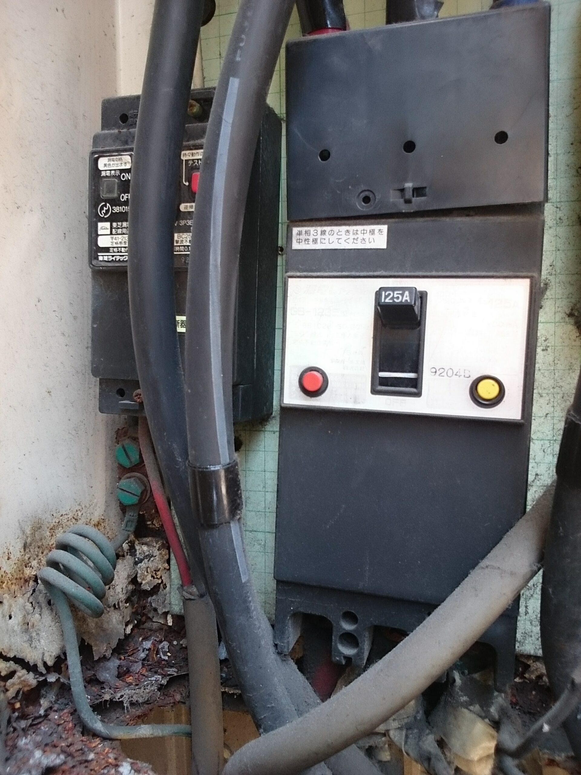 現場に急行して外の引き込み盤を開けると、内部がかなり古く、