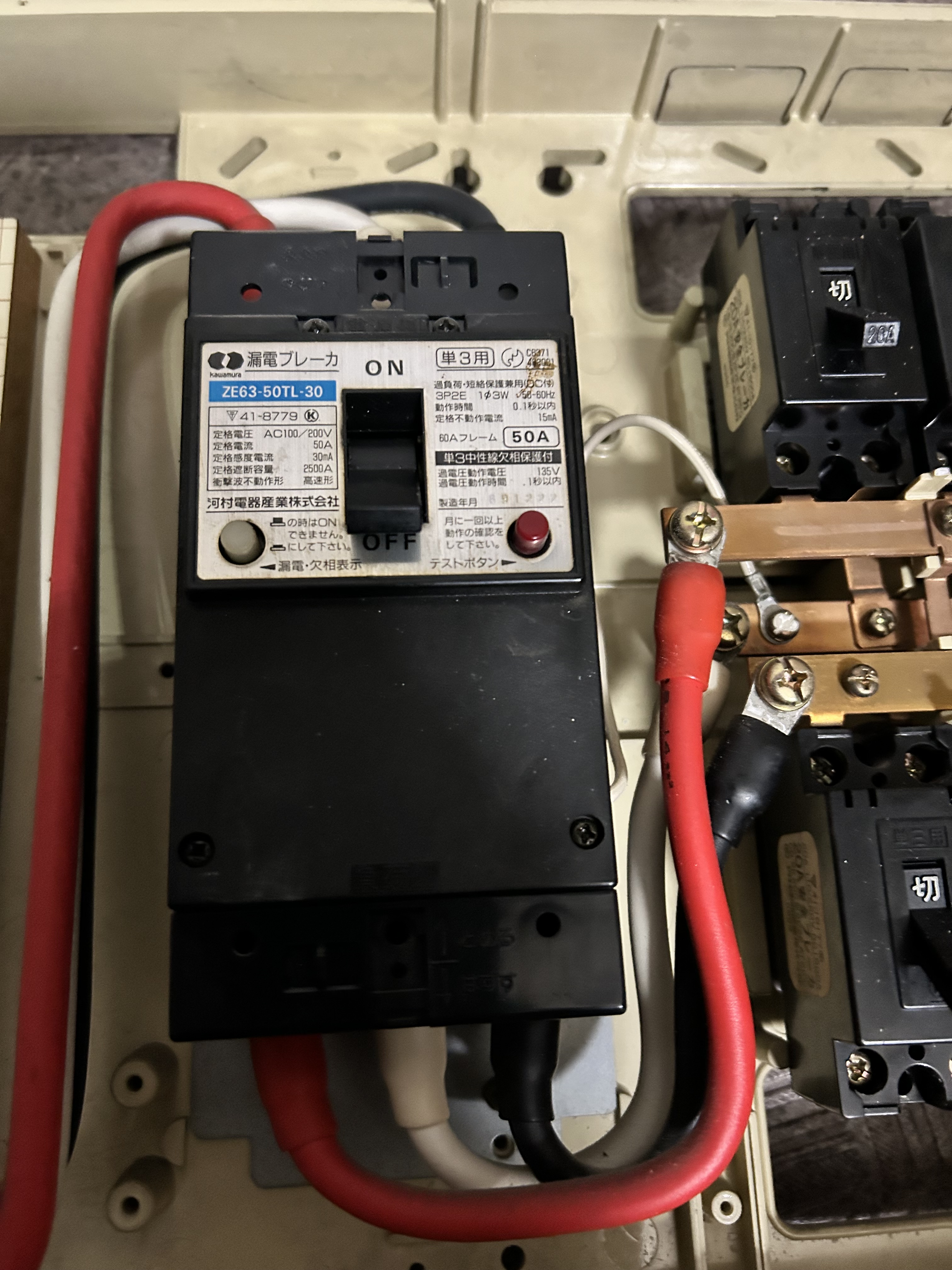 これが問題の漏電ブレーカー。このての物古くなると必ず上がらなくなります。