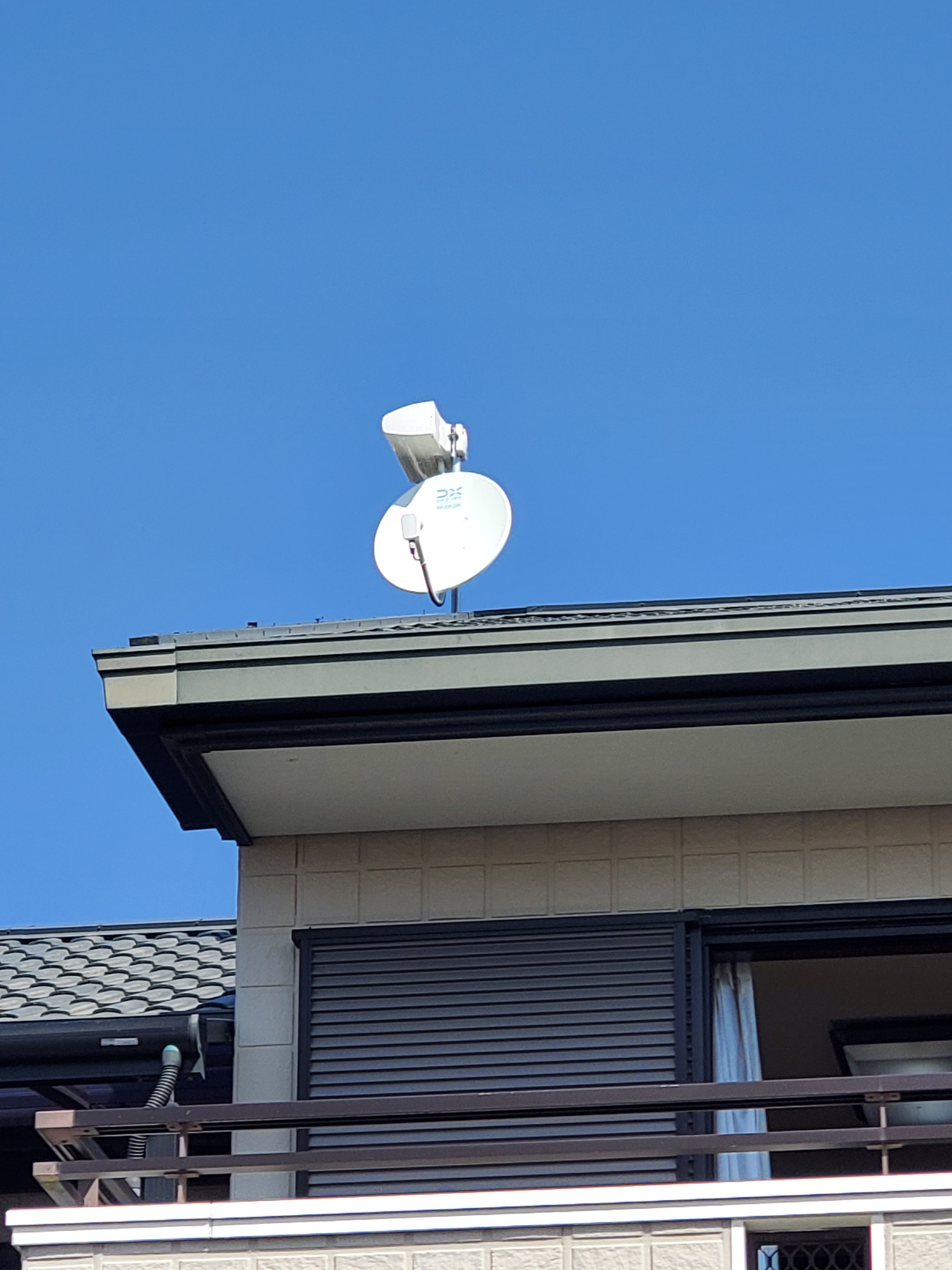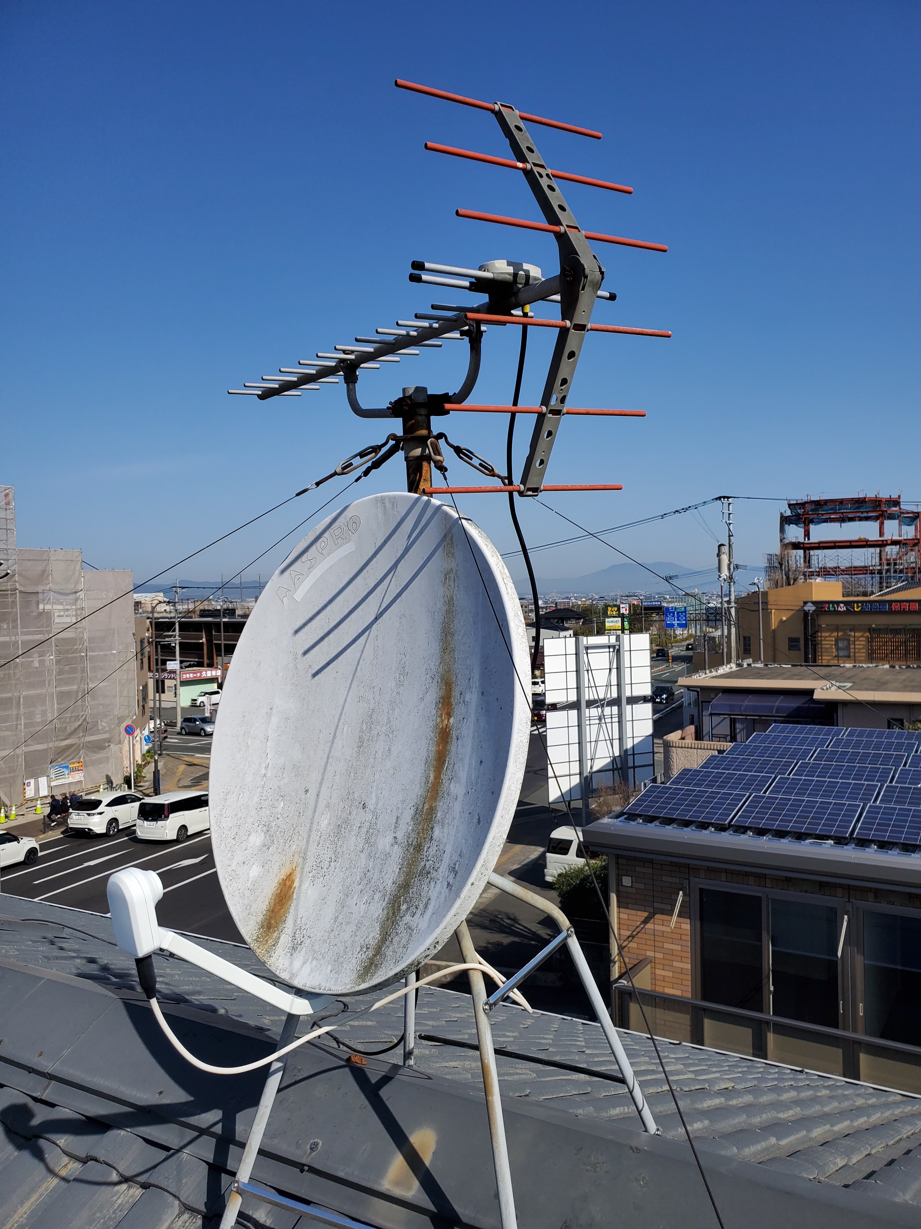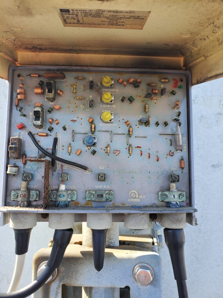 屋根上から調査、かなり古いアナログのブースター。