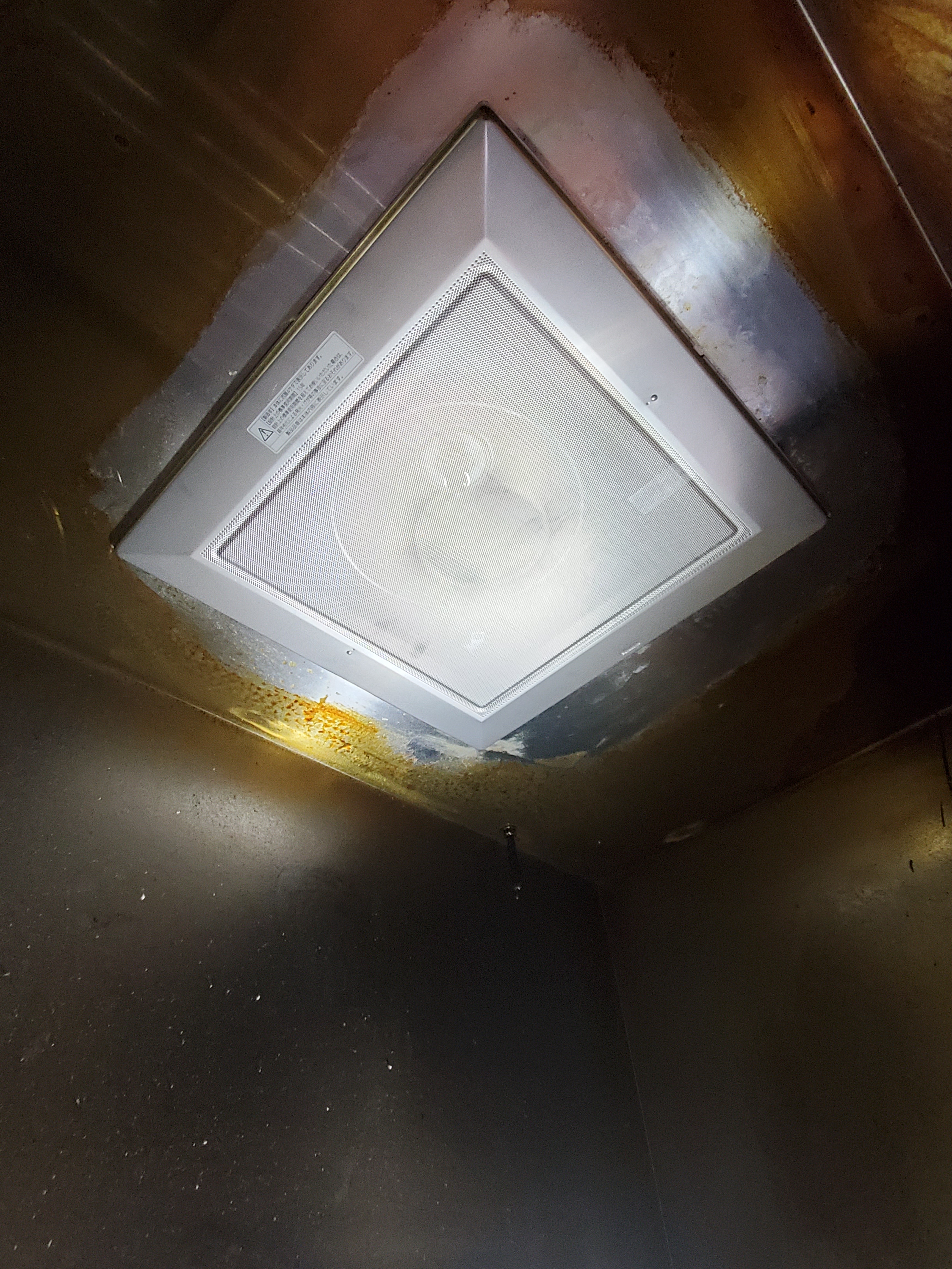 厨房の換気扇が故障してビル管理会社様より今すぐ依頼。フード内に取り付けられた一般仕様のダクト換気扇。